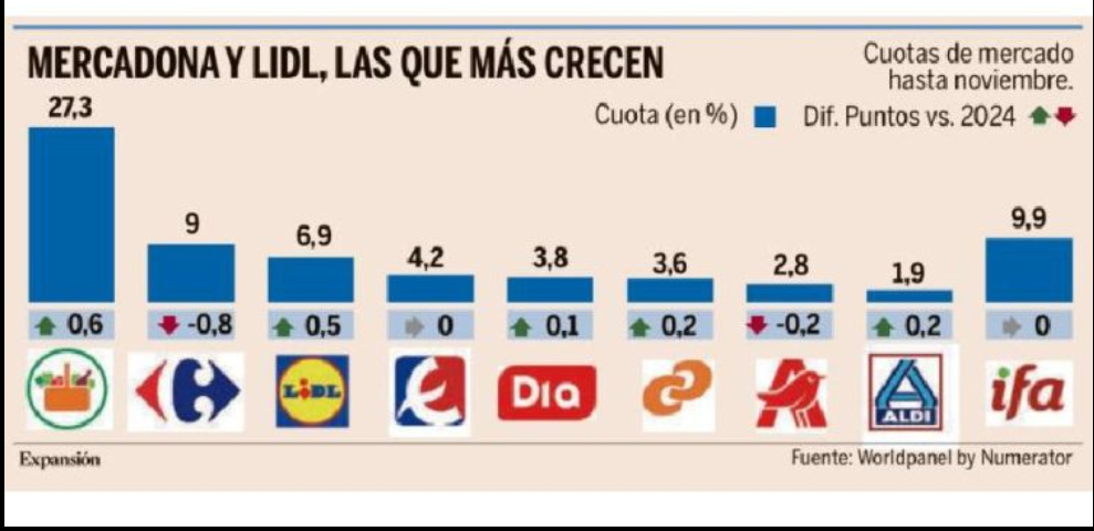Eroski e IFA: Mantienen la estabilidad, lo cual, dado el empuje de los líderes, puede considerarse un éxito de resistencia.